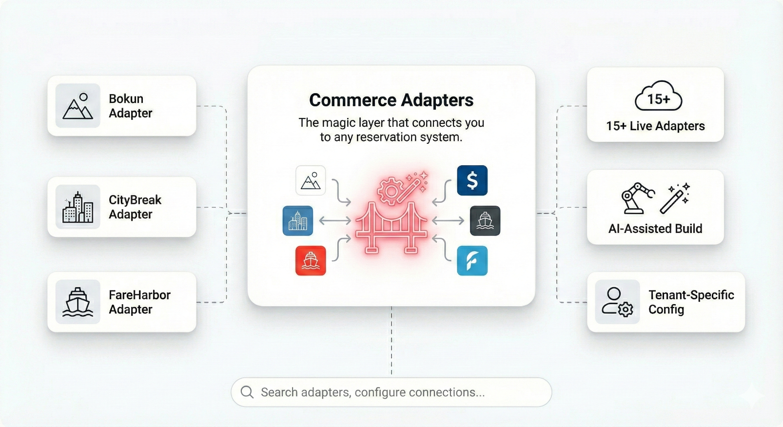 Adventure Hub uses adapters to communicate with third-party reservation systems (like Bokun, CityBreak, FareHarbor, etc.). These adapters normalize availability, product data, booking logic, and payments—so that your platform speaks one language, even if your suppliers don’t.