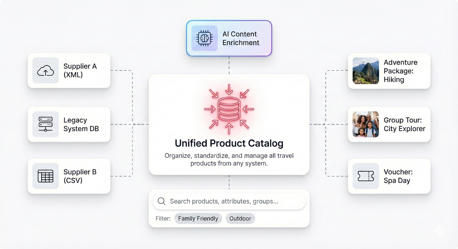 Adventure Hub imports product data from various supplier reservation systems and translates it into a structured, unified catalog. Products can be grouped, categorized, and enhanced with attributes (like “Family Friendly” or “Outdoor”), allowing for rich filtering and search options on the front end.
