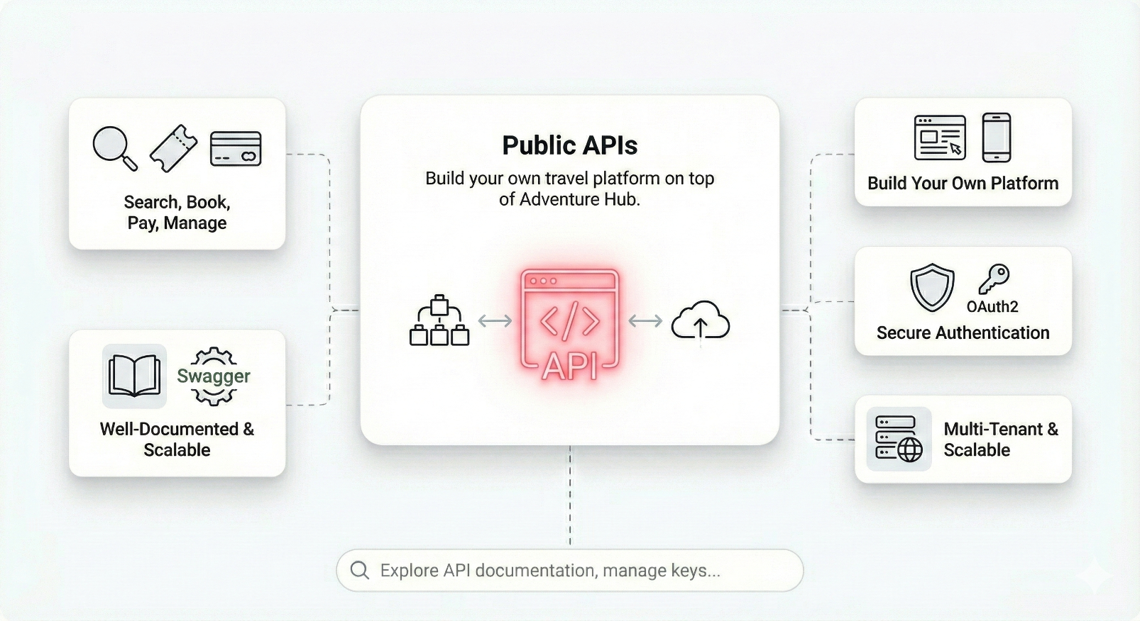 Adventure Hub is a modern, modular travel commerce platform designed to solve one big problem: fragmented supply. With our API-first, headless architecture, you can search, package, and sell products from any supplier—regardless of what system they use. Below are the core capabilities that make it happen.
